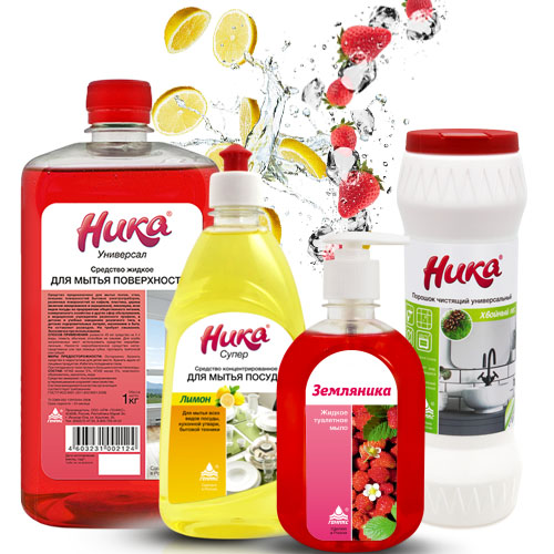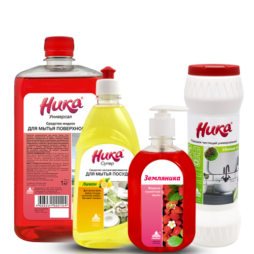 | Мыло жидкое туалетное «Земляника» - Состав: АПАВ, НПАВ. Средство для мытья посуды "Ника-Супер" - Состав: АПАВ >5%, НПАВ >5%, загуститель, комплексообразователь, ароматизирующая добавка, пищевой краситель. Чистящий порошок универсальный "Ника" - Состав: абразив более 50%, сода более 15%, кислородный отбеливатель, ПАВ, отдушка. Универсальное моющее средство "Ника-Универсал" - Состав: НПАВ менее 5%, АПАВ менее 5%, комплексообразователь, краситель, вода. | |